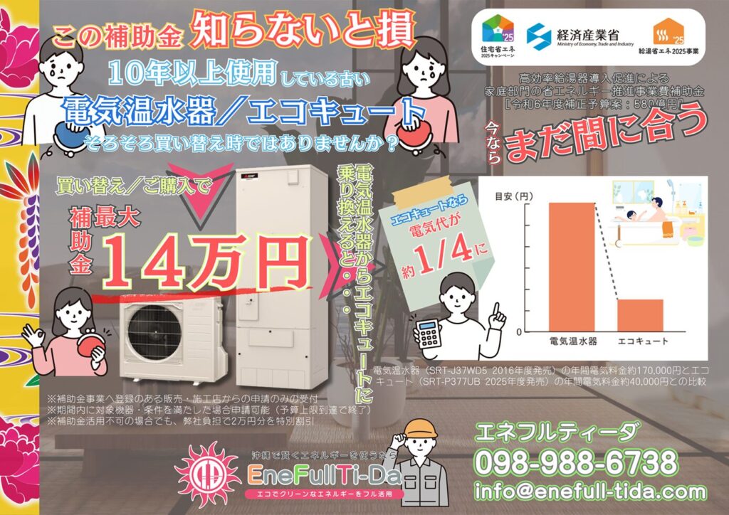 申請が殺到している現状で、補助金の枠に間に合わなかった…。または、申請対象外だったなど、補助金が使えないことが仮にあった場合、エネフルティーダへのご依頼であれば、独自の補助金を適応いたしますので、それだけでも他社での導入よりもお得に設置・買い替えが可能となります。